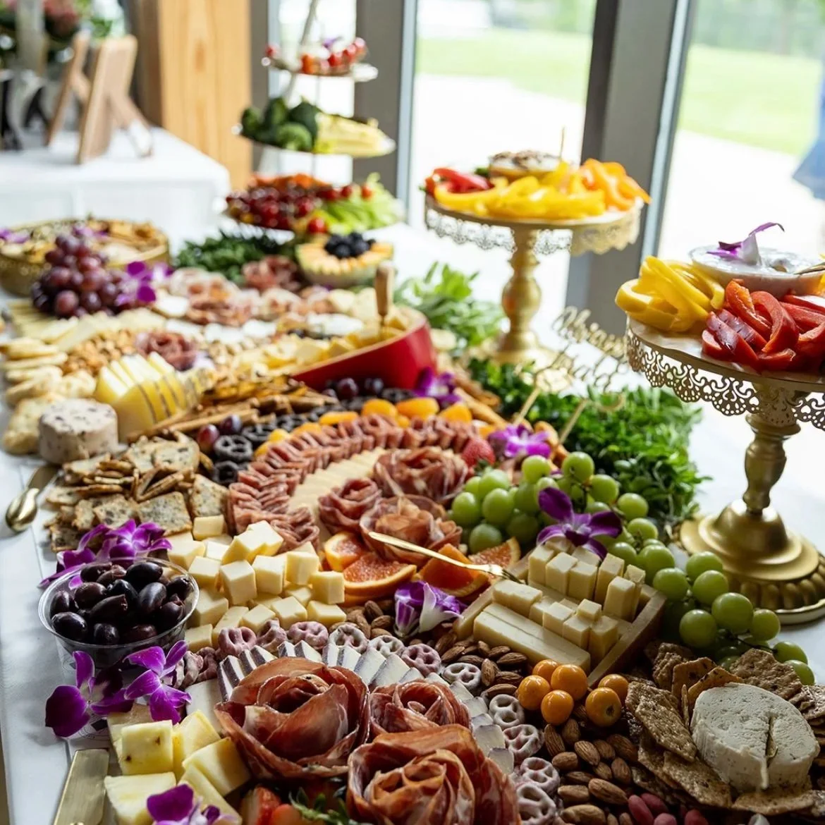 These grazing tables add a touch of elegance by incorporating various props, stands, and pedestals to make our charcuterie even more visually appealing.