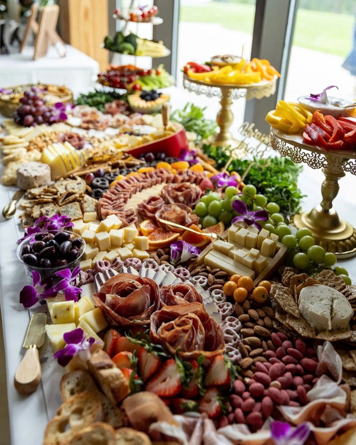 But these grazing tables are more than just easy on the eyes! They are also very functional because they make it easy to pick and choose from a wide variety of gourmet cheeses, cured meats, bread, fruit, nuts, jams, and so much more!